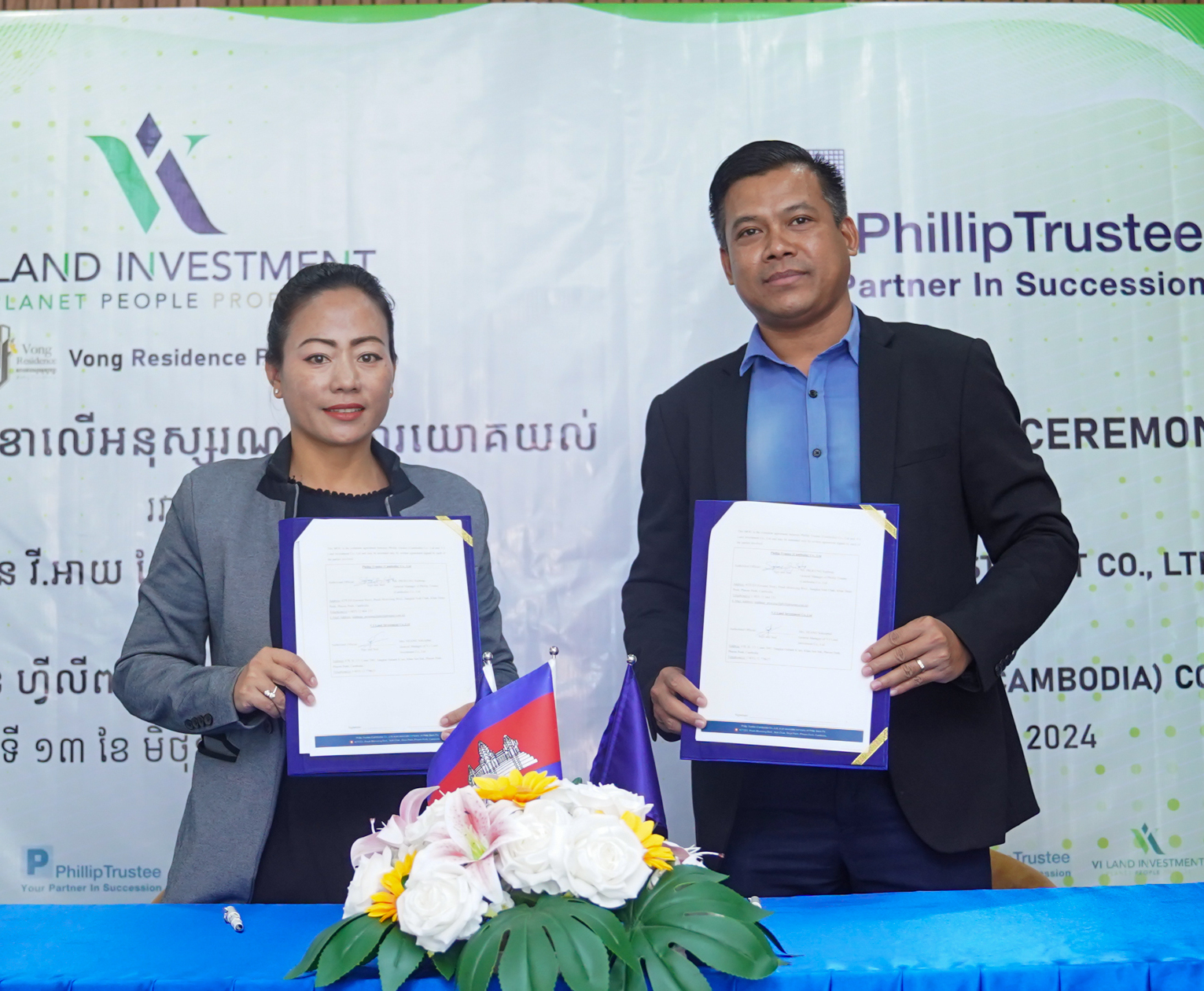 Phnom Penh, 13 June 2024 - Phillip Trustee (Cambodia) Co., Ltd. and VI Land Investment signed a Memorandum of Understanding (MoU). This collaboration aims to address the ever-growing market demand in the real estate sector and facilitate foreign homebuyers at VI Land Investment with the trust administration provided by Phillip Trustee.