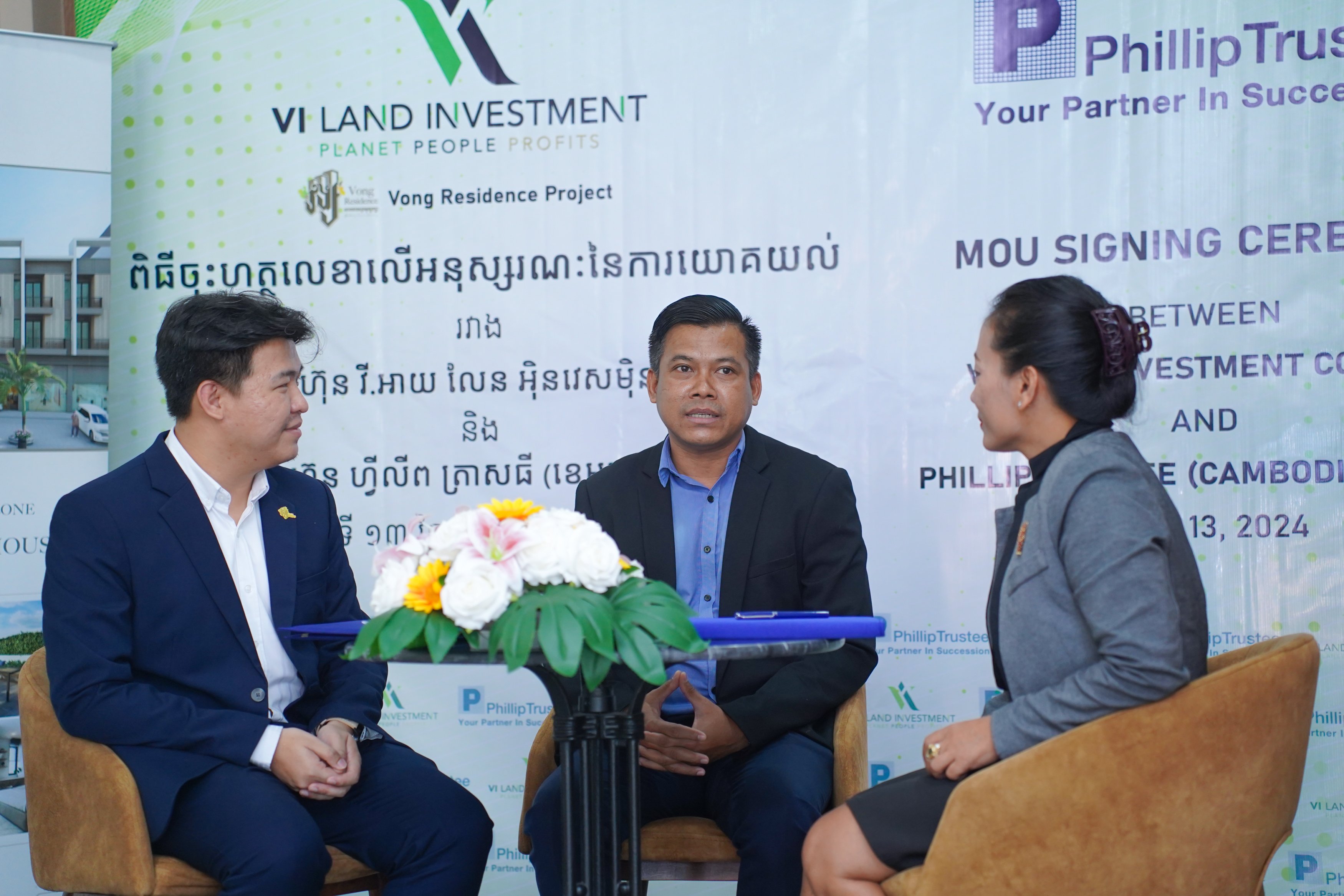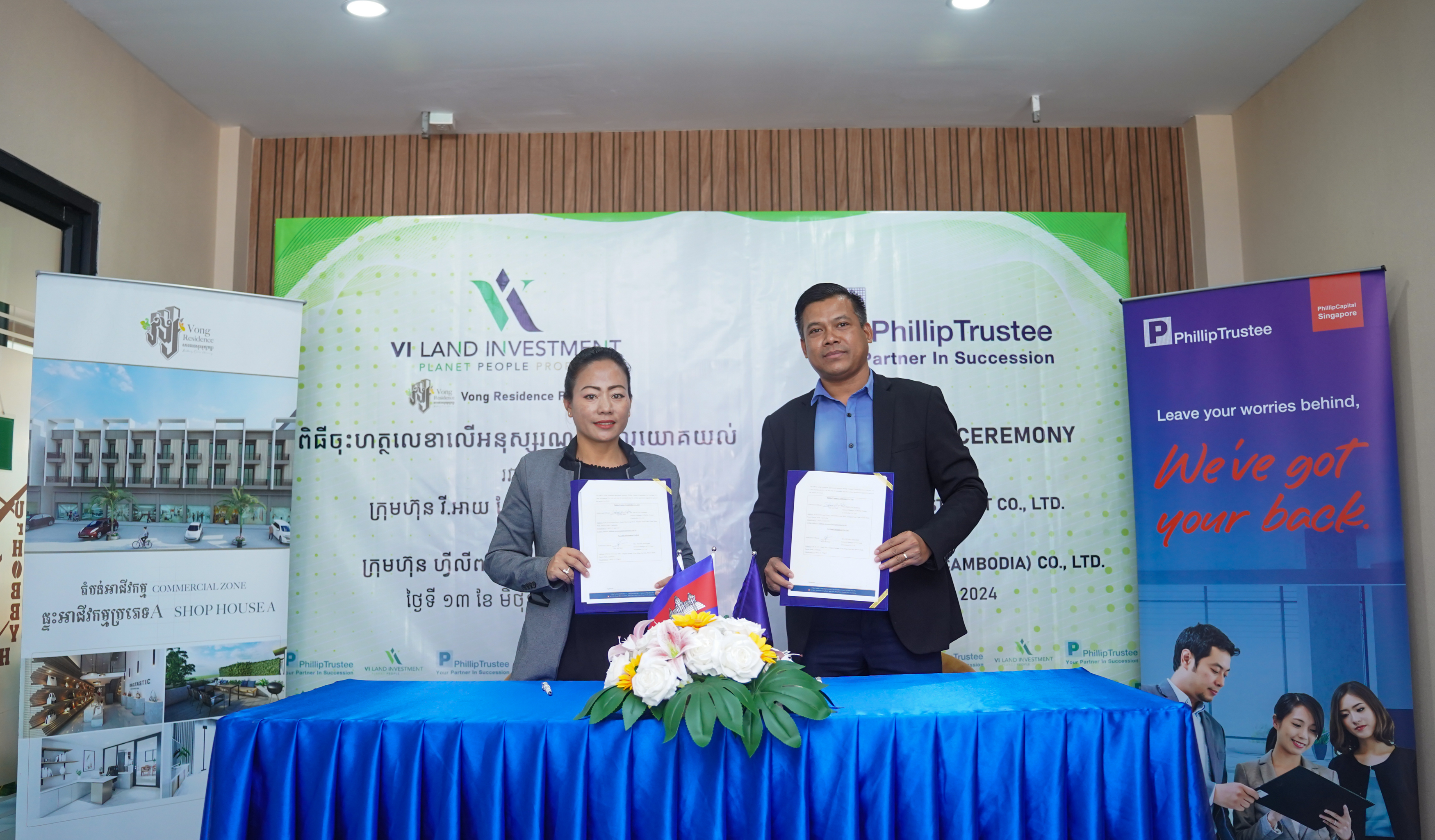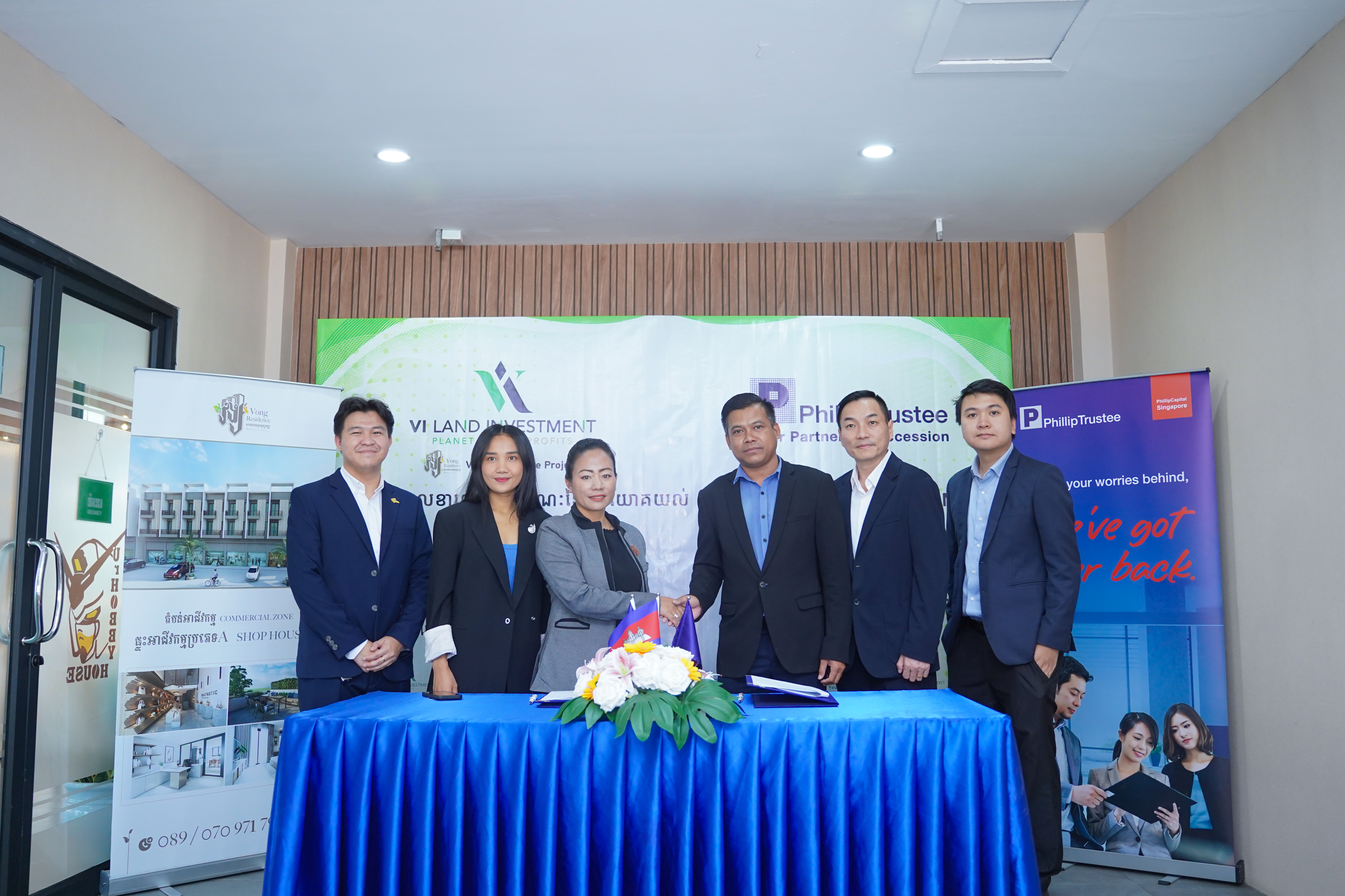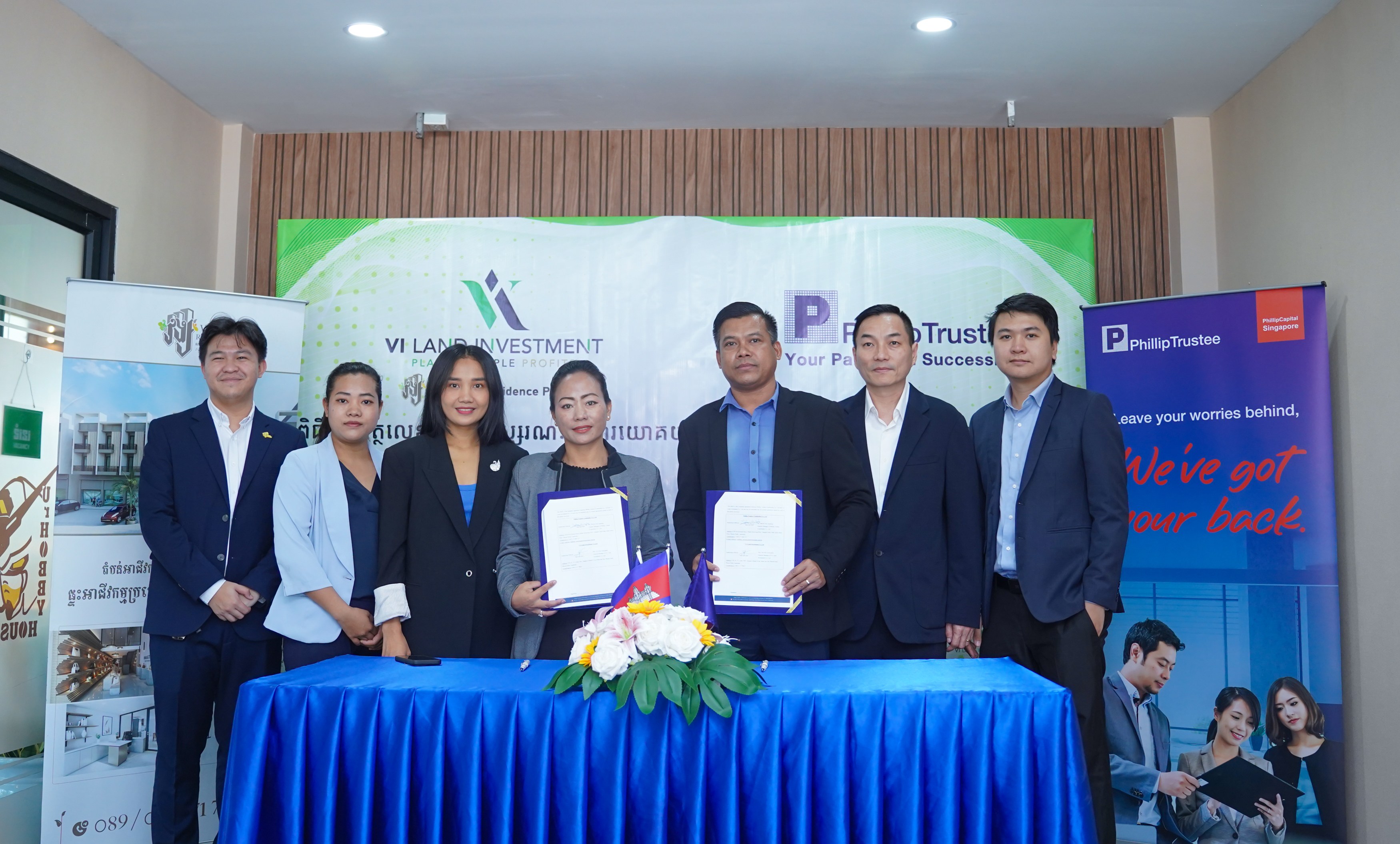 Phnom Penh, 13 June 2024 - Phillip Trustee (Cambodia) Co., Ltd. and VI Land Investment signed a Memorandum of Understanding (MoU). This collaboration aims to address the ever-growing market demand in the real estate sector and facilitate foreign homebuyers at VI Land Investment with the trust administration provided by Phillip Trustee.