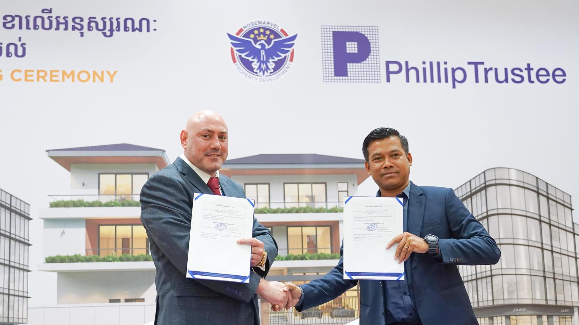 Phnom Penh, 19 May 2023 - RoseMarvel Property Development and Phillip Trustee (Cambodia) Co., Ltd sign a Memorandum of Understanding (MoU) to expand the overall scope of the market for products & services and to provide more convenience for foreign investors who looks into investing in a property within the Meanchey Residence since the Phillip Trustee can represent them in buying a property in Cambodia.