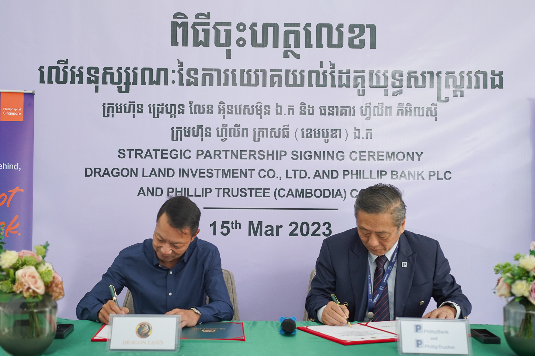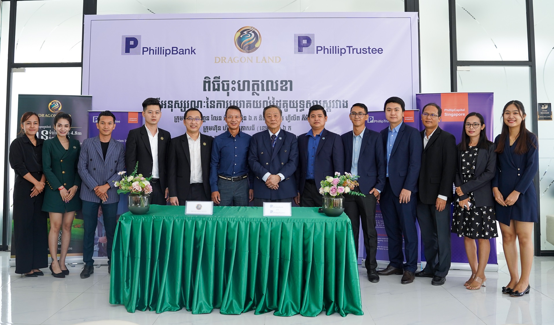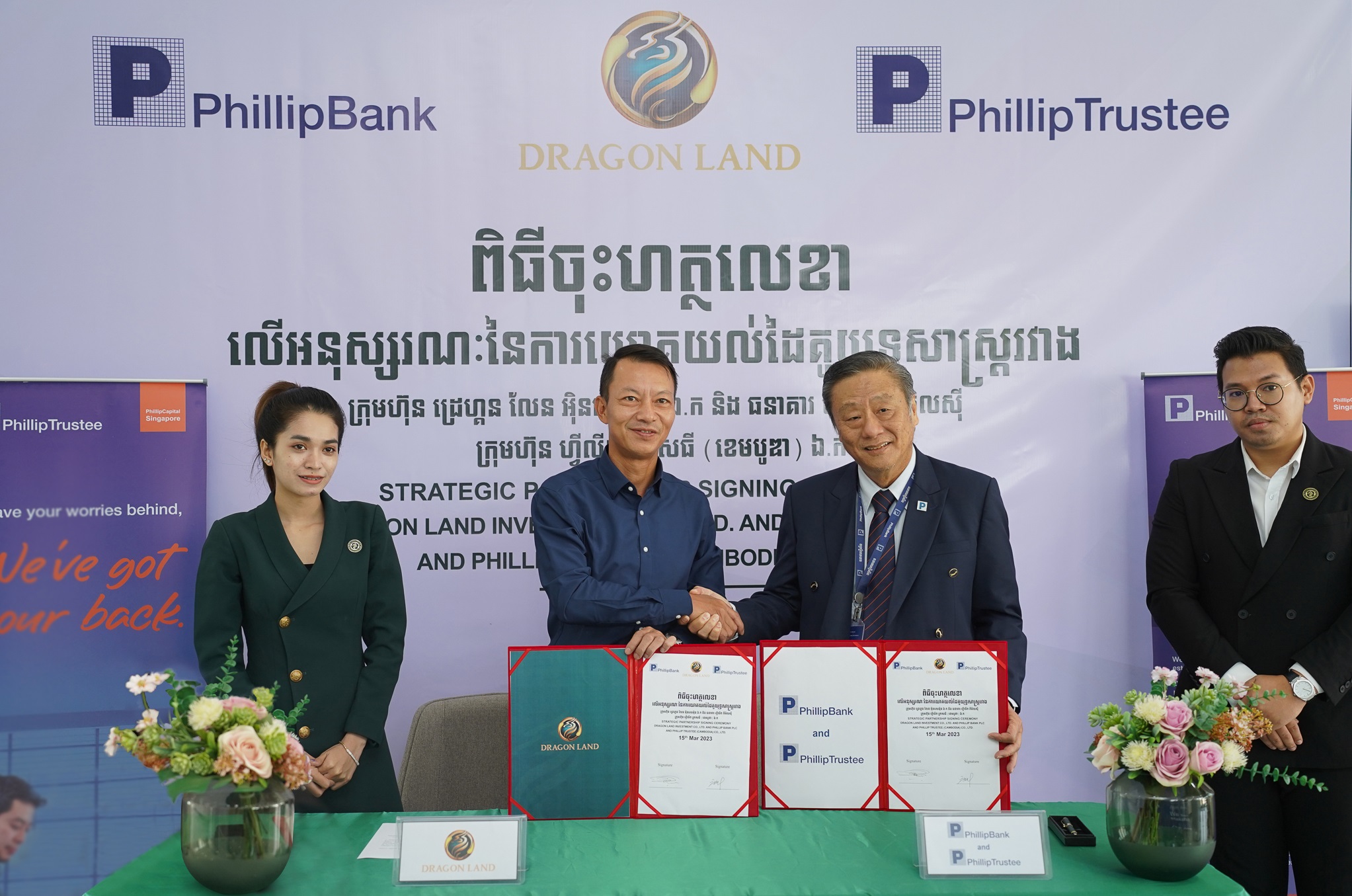 Phnom Penh, 15 March 2023 - Dragon Land Investment Co., Ltd. and Phillip Trustee (Cambodia) Co., Ltd., and Phillip Bank Plc sign a Memorandum of Understanding (MoU) to expand the overall scope of the market for products, services, and cooperation between Dragon Land Investment Co., Ltd. and Phillip Trustee (Cambodia) Co., Ltd. and Phillip Bank Plc. In particular, attracting international investors to build real estate credibility in the Cambodian market. With this MOU, all local and foreign clients can enjoy up to 80% housing loans with Phillip Bank.